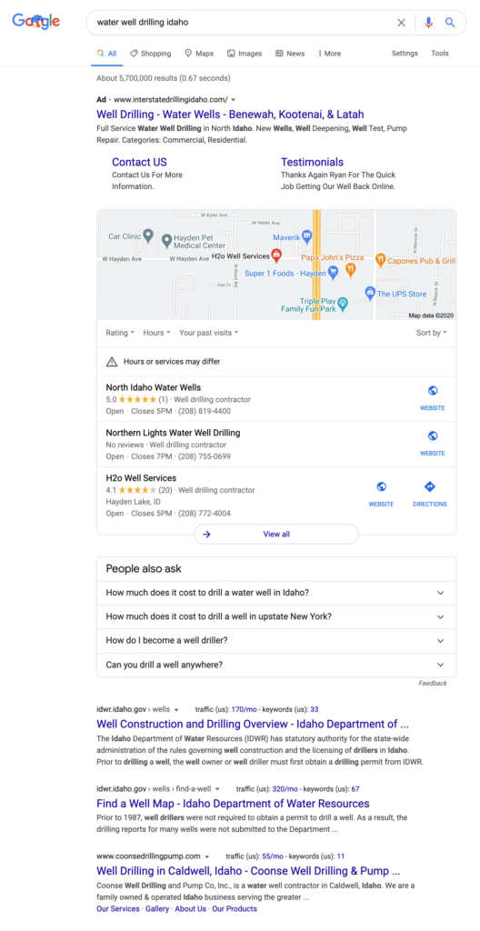 The first search result you see is actually an advertisement. This is why it says “Ad” next to it. When you click on this link, the person who put it there will be charged a certain amount of money. This amount is dependent on how many other people are bidding on the same search term. I won’t get too far into that, but the general idea is that someone pays when you click on that. They are paying Google a commission for being the very first search result on the page for this search term: “water well drilling Idaho”.